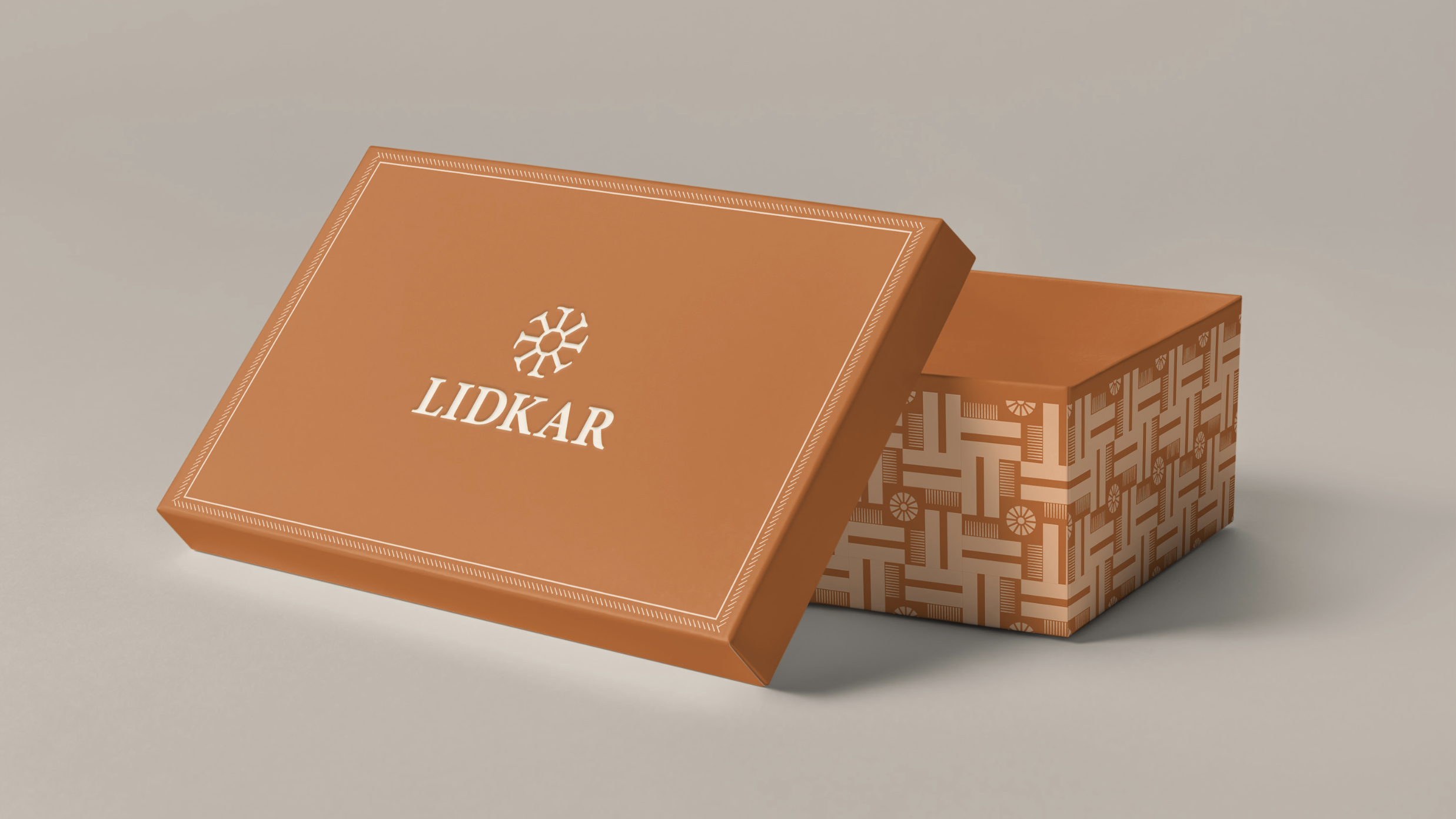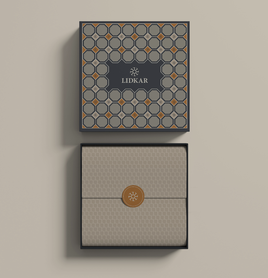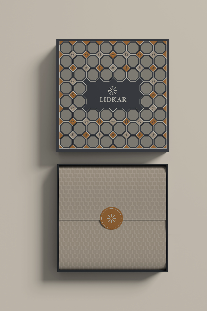 The packaging design is a blend of traditional craftsmanship and modern sophistication. The designs feature motifs inspired by various leather craft techniques and patterns derived from the Lidkar logomark, creating a unique and luxurious brand identity.