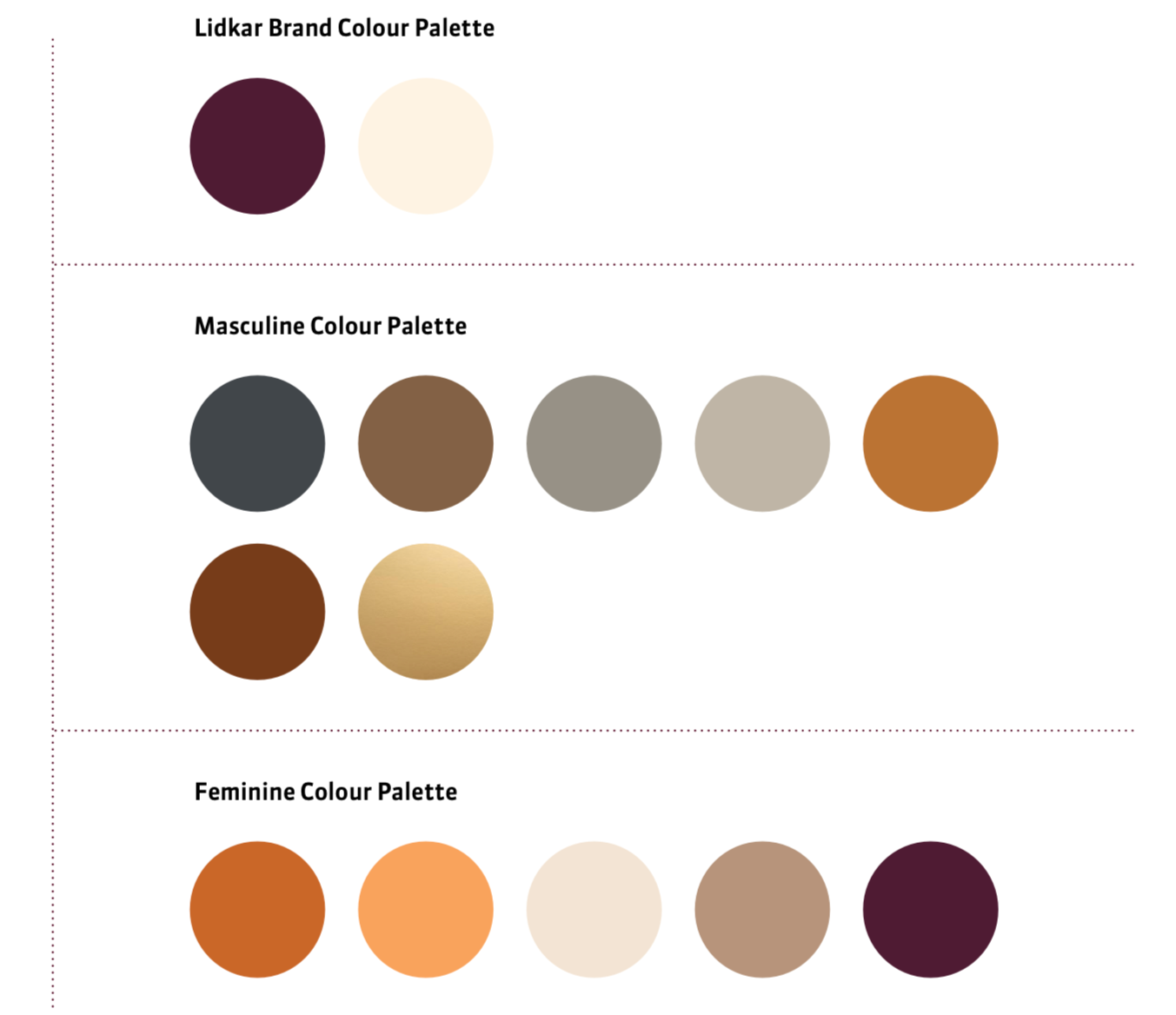 of leather, blending harmonious shades of browns, oranges, and beige, complemented by the brand’s signature purple. Two distinct palettes were crafted to cater to different product categories, with attention to the primary target audience.